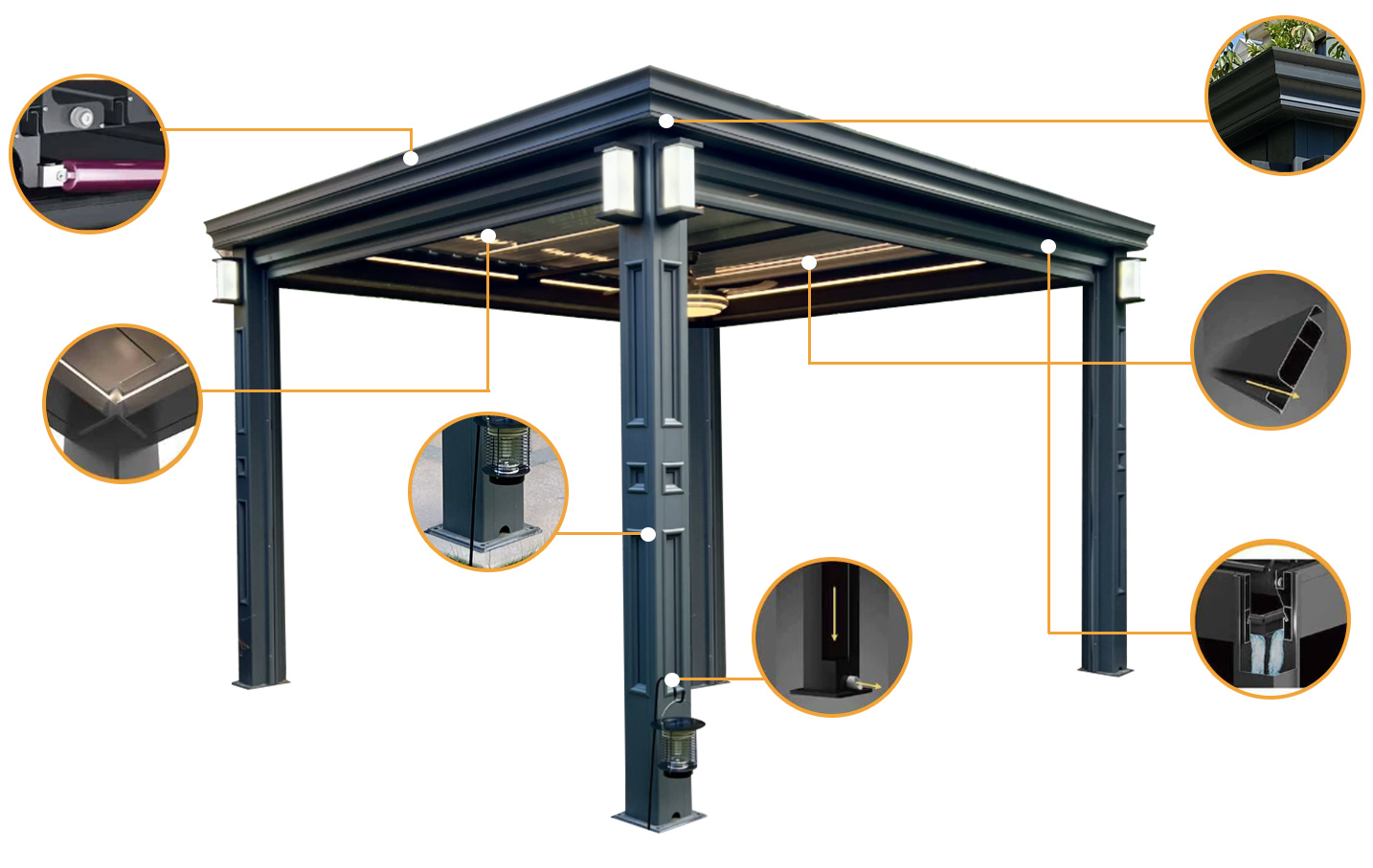 The advanced smart pergola system designed for any season. The pavilion has the function of shading, rain and wind protection and UV
